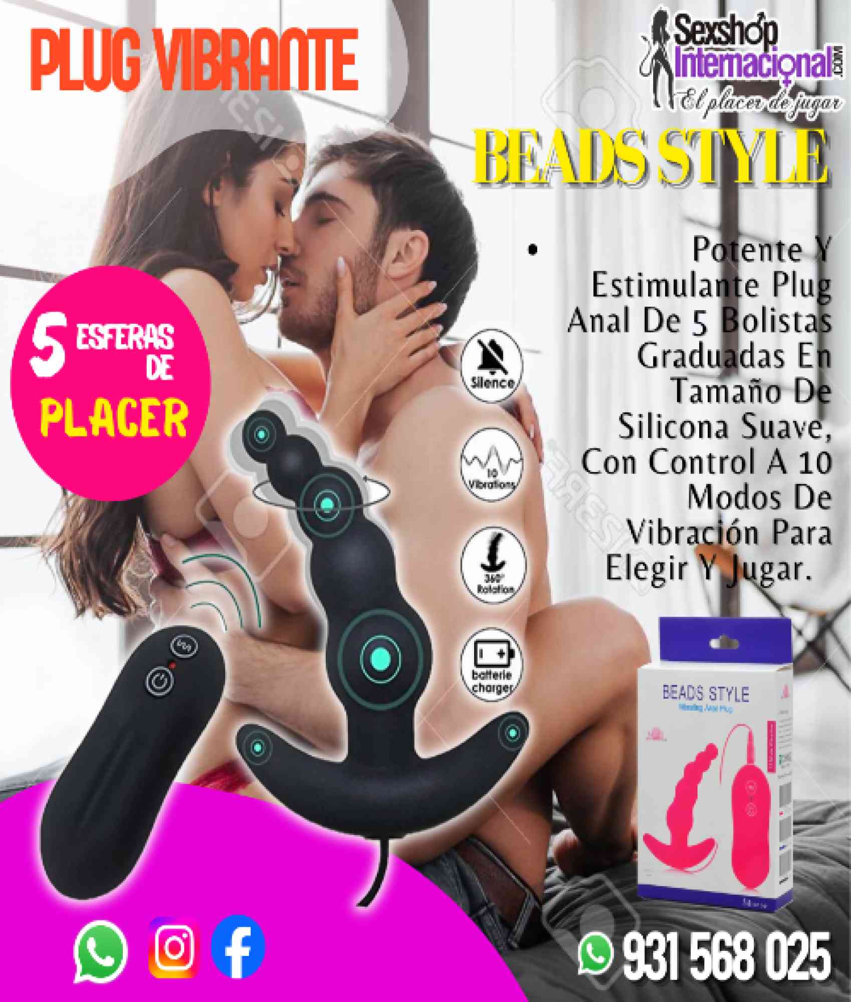 Potente Y Estimulante Plug Anal De 5 Bolistas Graduadas En Tamaño De Silicona Suave, Con Control A 10 Modos De Vibración Para Elegir Y Jugar.