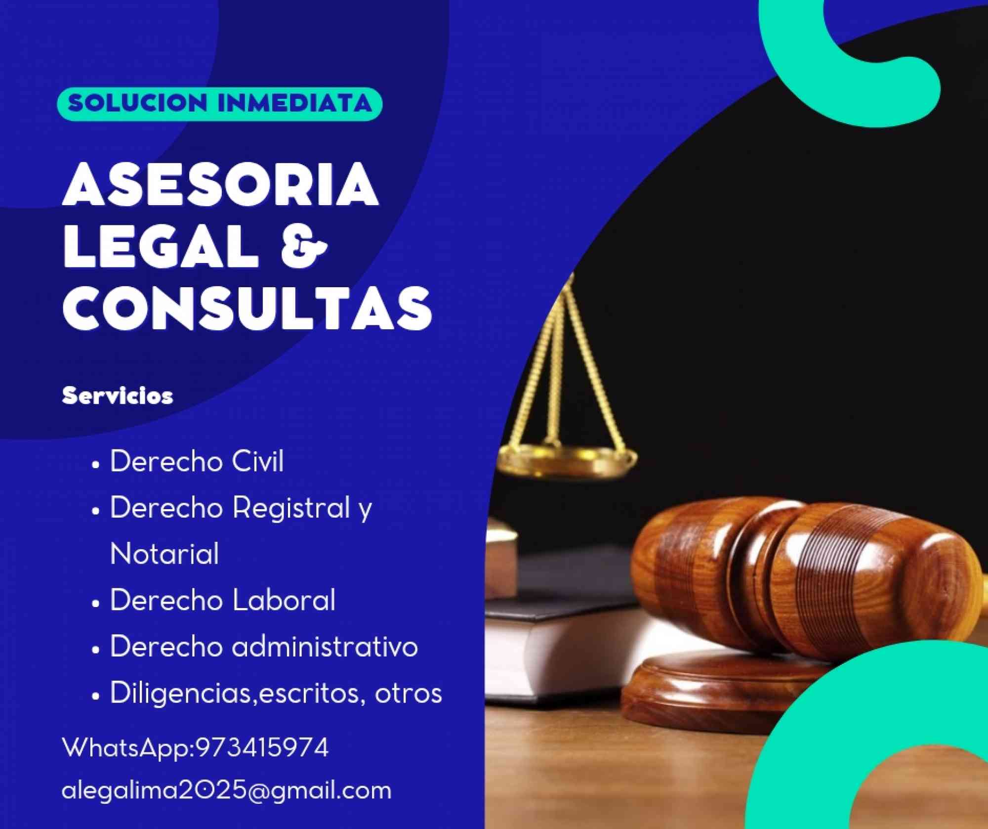 Se brinda asesoría legal civil, comercial, laboral,Registral,notarial, administrativo,y Saneamiento inmuebles escribir al 967647235